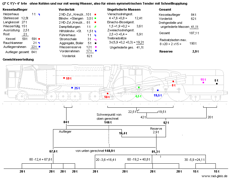 Im Schnitt G sind orange drei zu öffnende Deckel coloriert. Nach Ausbau der Blasrohre und Schornsteine sind durch sie alle Heiz- und Rauchrohre zu Reinigungszwecken zugänglich. Auch mit etwas elastischen Ausblas- Lanzen von voller Rohrlänge kann gearbeitet werden, wobei sie, herausgezogen, bis in den Führerstand reichen. Zum Auswechseln von Rauchrohren, die nicht elastisch sind, muss etwas mehr abgebaut werden, bei abgenommenem Kessel jedoch nur der Rauchkammer- Vorbau mit den Türrahmen. Es ist dieses das in der Seitenansicht dreieckige Teil zwischen den hinteren, großen Rädern. Es erweitert das Volumen der Rauchkammer, um die Saugzug- Schwankungen durch die Auspuffschläge zu verringern. Hauptsächlich allerdings muss es eine Rauchkammertüre mit senkrechten Scharnieren tragen, die sich zum Raum hinter dem Führerhaus hin öffnet. Damit nicht zur dortigen Seitentüre hinaus geschaufelt werden muss, gibt es einen Trichter nach unten. Solche Trichter innerhalb der Rauchkammer haben sich nicht bewährt, weil sie nicht dicht zu halten waren. Im Gegenteil ist man sogar dazu übergegangen, den Boden der Rauchkammer mit Beton auszugießen. In einen Trichter außerhalb der Rauchkammertüre kann man von einem glatten Boden gut hinenkratzen und -fegen. Die seitlichen, orange markierten Kreissegment- Deckel sind verschraubt. Falls sie, wider Erwarten, ebenfalls öfters geöffnet werden müssten, wäre in der Vorderlok- Stromschale, die dort über die Rauchkammer- Vorderkante zurück ragt, eine Schiebetüre vorteilhaft. Schnitt H geht im unteren Teil durch die Achslager, um die Engstelle für die Dampfleitungen zu kontrollieren. Im oberen Teil geht Schnitt H durch das Führerhaus, wo wegen der Dampfleitung der Fußboden um eine Stufe erhöht ist. Das gilt nur für den Durchgang zwischen den Radkästen, um zum linken Stehplatz zu gelangen. Davor gibt es ein herausnehmbares Holzpodest mit einen um eine weitere Stufen erhöhten Fußboden im Bereich des verstellbaren Hochsitzes, siehe Beschreibung der Sichtverhältnisse in Teil 13.1.! Schnitt K zeigt schließlich Blindwelle und Innentriebwerk. Die Hochdruckzylinder hätte man zur Not auch nebeneinander plazieren können. Dazu hat man ihre Achsen häufig um einige Grad gegeneinander verdreht. Hier erschien es günstiger, die Zylinder hintereinander zu setzen. Die zusätzliche hin- und hergehende Masse der verlängerten und etwas dickeren Kolbenstange ist sogar von Nutzen, weil so dieselbe Masse wie auf der Niederdruck- Seite erreicht wird, wo ja der Kolben schwerer ist. Weil bei dieser Anordnung alle hin- und hergehenden Bewegungen praktisch in einer Ebene stattfinden, sind die Kräfte ideal ausgeglichen. Die Kurbeln sind auf jeder Seite um 180° versetzt, und zwischen links und rechts um 90°. Die kürzere Hochdruck- Kolbenstange erhält in der Nähe des Kreuzkopfes ein Zusatzgewicht. Über die Gründe, warum die Treibstangen auf eine Blindwelle, und nicht auf eine gekröpfte Radsatzwelle arbeiten, wurde bereits an mehreren Stellen eingegangen. Um beim Hinzufügen des dritten Treibradsatzes nicht einen Teil der Vorteile aufgeben zu müssen, und um bei gleichen Radsätzen und Kuppelstangen bleiben zu können. wurde eine zweite Blindwelle eingefügt. Sie kann jedoch wesentlich leichter ausgeführt werden, weil keine Drehmomente zwischen links und rechts zu übertragen sind. Im Idealfall gibt es nur Kräfte zwischen Kurbelzapfen und Gegengewichten, um die Fliehkräfte auszugleichen. In der Praxis fluchten die Kuppelstangen allerdings nicht exakt, so dass es durchaus Kräfte auf die Blindwellen- Achslager gibt. Unten folgt noch eine Abschätzung der Gewichtsverteilung, weil immer wieder die Frage gestellt wird, ob die Treibachsen genug belastet sind, wenn der Kessel nicht darüber liegt. Weitere Berechnungen sollen bei Gelegenheit folgen. Vorerst verlangen die Karten zur Streckengeschichte meine ungeteilte Aufmerksamkeit. Fortsetzung: 13.3. Weitere Varianten und Ausblick |
