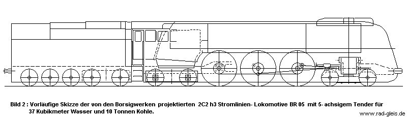 Dank der guten Verbindungen, die unsere Redaktion mit führenden Konstruktionsingenieuren weltbekannter Lokomotivhersteller aus dem deutschsprachigen Raum pflegt, ist es uns erlaubt, als erste und einzige von der Gründung eines neuen Arbeiskreises zu berichten. 200 km/Stunde nach Fahrplan, das ist Name und Ziel dieser lockeren, wechselnd besetzten und unregelmäßig zusammentreffenden Vereinigung von Ingenieuren. Das soll kein Fernziel sein, sondern ein Ziel, das sich zügig realisieren lässt. Die Mitglieder des Arbeitskreises sind der Meinung, dass alle erforderlichen technischen Grundlagen bekannt sind, und die meisten Komponenten auch schon an serienmäßigen Lokomotiven erprobt sind. Man müsse sie nur noch zu einem neuen Konzept geschickt kombinieren. Dabei geht es dem Arbeitskreis nicht um Rekordfahrten. Dass dabei schon in wenigen Jahren die magische 200 km/St.- Grenze durchbrochen sein wird, daran zweifelt niemand. Um Geschwindigkeits- Rekorde ist es in letzter Zeit zwar etwas ruhiger geworden, das liegt aber daran, dass in Amerika und England die magische Grenze bei 100- Meilen pro Stunde , also 161 km/St. lag, und diese nun schon mehrfach überschritten wurde. In England ist man inzwischen bei 181 km/St. angekommen. Von den zweifelhaften Werten amerikanischer Rekordfahrten wollen wir hier nicht reden. Immerhin sind die Ingenieure beeindruckt, mit welch schweren Zügen in Amerika Rekordfahrten durchgeführt wurden. Dazu meinte ein von der offiziellen Entwicklungsrichtung in Deutschland enttäuschter Teilnehmer, man könne bei den französischen und amerikanischen Dampfloks viele neue Konzepte bewundern, während hier nur die traditionelle Schnellzuglokomotive durch Anwendung von Stromlinien- Verkleidungen und Erhöhung der Leistung weiterentwickelt werde. Das trifft in der Tat auf die Projekte für 175 km/St Spitzengeschwindigkeit zu. Von diesen erscheint uns die oben in Bild 2 skizzierte Borsig- Lokomotive durchaus mit den englischen Rekordloks konkurrenzfähig zu sein. Sie soll mit einem 250- Tonnen- Zug 160 km/St. fahren und kurzzeitig auch 175 km/St. Bei wenig Last könnte sie auch wohl 200 km/St. erreichen, würde dabei aber die erlaubte Drehzahlgrenze überschreiten. Am 11.Mai 1936 brachte die BR05 einen 200- Tonnen- Zug auf knapp über 200 km/h// |