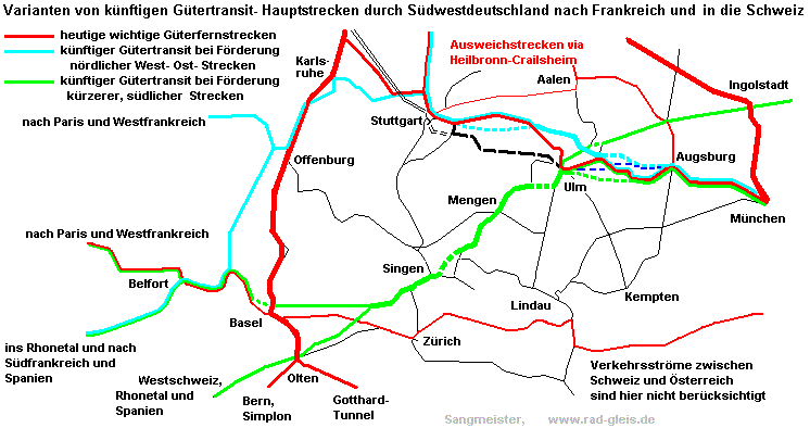Bei schrittweiser Zunahme des Güterverkehrs auf der Achse Karlsruhe/Mannheim- MünchenIn der obigen Skizze türkisblau dargestellt. Stufenweises Aufrüsten oder vorausschauende Gesamtplanung? Auch Stufe 3 ist nicht wirklich als Dauerzustand erstrebenswert, schon wegen der Lärmbelastung der Ballungsgebiete entlang der Altstrecke. Auch für Güterzüge wird die Forderung nach Verkürzung der Fahrzeiten immer lauter werden. Weil die Baukosten von Stufe 4 nicht wesentlich höher liegen würden, müsste man eigentlich schon heute diese als Endziel ansetzen. Dann würde man sich mit passenderen Zwischenstufen einige Verrenkungen ersparen. Wie sind die folgenden Kapitel in diesem Zusammenhang zu sehen? Es ist schon fast ein Witz, und wird manchen Leser überraschen, dass ich inzwischen eine gewisse Wahrscheinlichkeit sehe, dass die Stuttgart21- Planung doch ausreichen könnte. Nämlich dann, wenn sich der Güterverkehr in eine andere Richtung orientieren sollte, wie im Folgenden dargestellt. |